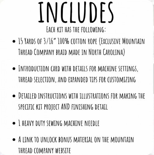Sew your very own set of rope coasters and a matching rope storage bowl for them with this Set of Coasters and Basket DIY Rope Basket Kit from The Mountain Thread Company. These coasters are unique, durable, washable, beautiful - and, best of all - made by you! The kit makes four 4-inch coasters and a 5-inch storage bowl to hold them. Make it even more unique by using up fabric scraps from old projects! This is a sewing machine project. Your sewing machine will need a zigzag stitch and be able to handle sewing something like jeans. 50wt high quality thread is also highly recommended. This is an introductory basket project for sewists who are confident in steps like changing the machine needle, adjusting stitch length and width, and pivoting. This is a Do It Yourself Kit—no finished products are included.